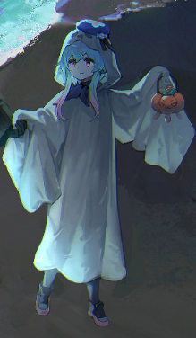 Mizuki is here, dressed up as a little ghost, and bouncing around to make sure the little finishing touches to things are done. There's "spooky", fun music playing from the phone he has set on the table by the food. And, as he's stated, there's a box filled with costumes. They're mostly silly, and there's quite a lot of them. More than it seems like is able to fit in a box this size, actually? How strange. Maybe it's some kind of enchantment? Well, whatever, you can surely find one in here that will suit you. Mizuki seems to scoot you towards it if you don't dress up, so...